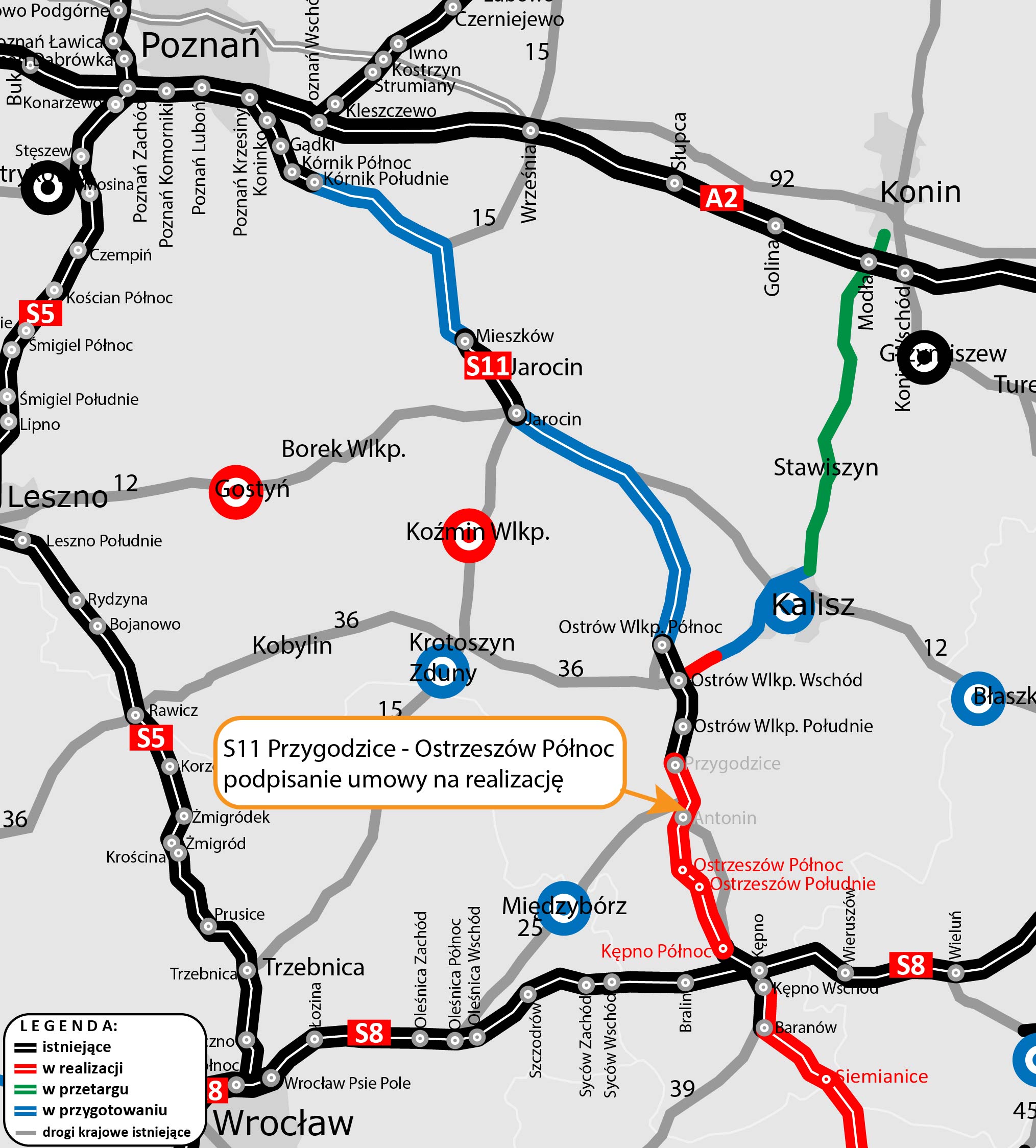 Odcinek drogi ekspresowej S11 Przygodzice – Ostrzeszów o długości 12,6 km to kluczowy fragment infrastruktury w południowej Wielkopolsce. Nowa trasa, poprzez istniejący już odcinek S11, połączy dwa istotne, lokalne ośrodki: Ostrów Wielkopolski i Ostrzeszów umożliwiając szybki, bezpieczny i komfortowy przejazd z pominięciem zatłoczonych dróg krajowych. W ramach inwestycji powstaną dwa węzły drogowe: Przygodzice, który umożliwi wjazd na drogę samorządową (stary przebieg DK11 utarci status drogi krajowej) oraz dojazd do miejscowości Przygodzice, a także Antonin, który zapewni sprawne połączenie z drogą krajową nr 25 w kierunku Oleśnicy i Wrocławia.
