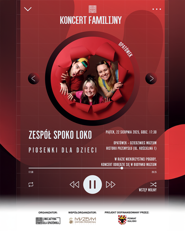 Koncert odbędzie się w najbliższy piątek, 22 sierpnia 2025 r. o godz. 17:30 na dziedzińcu Muzeum Historii Przemysłu w Opatówku – współorganizatora wydarzenia. W razie niekorzystnej pogody, zapraszamy małych melomanów wraz z opiekunami do wnętrza Muzeum. Koncert odbywa się w ramach projektu „Spotkania ze sztuką – Opatówek 2025”, dofinansowanego przez Powiat Kaliski.