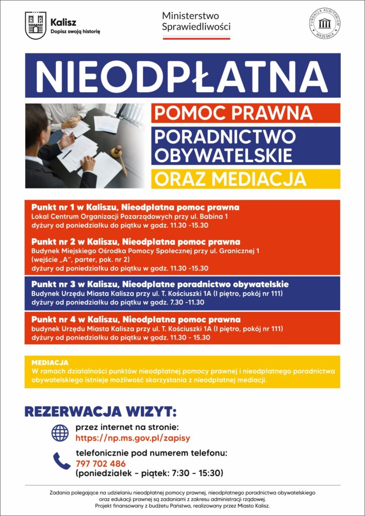W 2025 roku w Kaliszu funkcjonują cztery punkty, w których radcowie prawni, adwokaci i prawnicy wskazani przez organizacje pozarządowe świadczą bezpłatną pomoc.