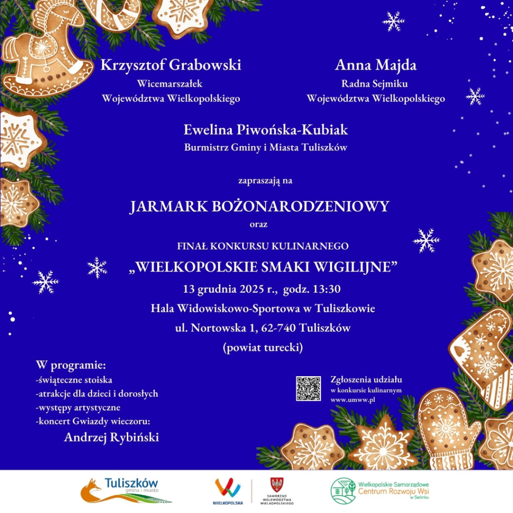 Samorząd Województwa Wielkopolskiego wspólnie z Gminą Tuliszków zaprasza na kolejną edycję Jarmarku Bożonarodzeniowego wraz z konkursem kulinarnym dla Kół Gospodyń Wiejskich „Wielkopolskie Smaki Wigilijne”. Jarmark odbędzie się 13 grudnia 2025 roku