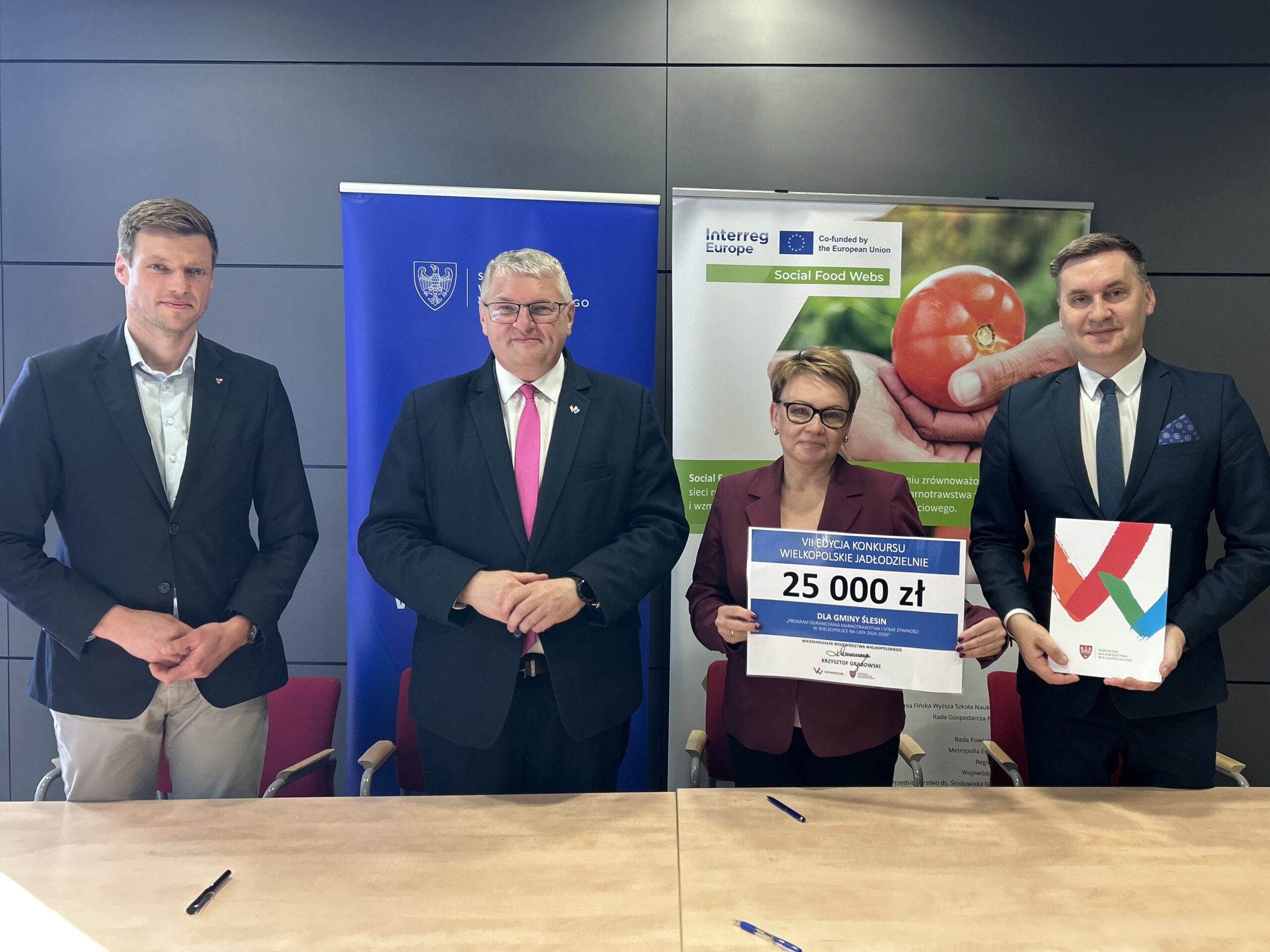 24 kwietnia 2026 r. w siedzibie Urzędu Marszałkowskiego w Poznaniu, Wicemarszałek Województwa Wielkopolskiego Krzysztof Grabowski podpisał umowę z włodarzami trzech gmin – Ireneuszem Augustyniakiem, Wójtem Gminy Malanów; Januszem Piechockim, Burmistrzem Miasta i Gminy Margonin; Piotrem Maciejewskim, Burmistrzem Miasta i Gminy Ślesin – które w wyniku rozstrzygnięcia konkursu otrzymają wparcie finansowe na cel otwarcia jadłodzielni.